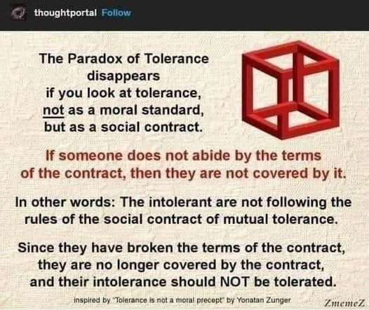 This connects to the so-called “Paradox of Tolerance” in society. It is a perfect example of why this sort of a social contract inherently exists. This is often brought up when a hate group demands you tolerate their hate, because “you are all about tolerance, aren’t you?” The social contract of tolerance is as such: If someone does not abide by the terms of the contract, then they are not covered by it. In other words: the intolerant are not following the rules of the social contract of mutual tolerance. Since they have broken the terms of the contract, they are no longer covered by the contact, and their intolerance should NOT be tolerated. (This was taken from a great image found on the internet, posted below). For instance, Nazis believe everyone except a specific kind of white person should be killed, as such, they are not covered by the social contract of tolerance, so we tried our best to exterminate them. Tried.