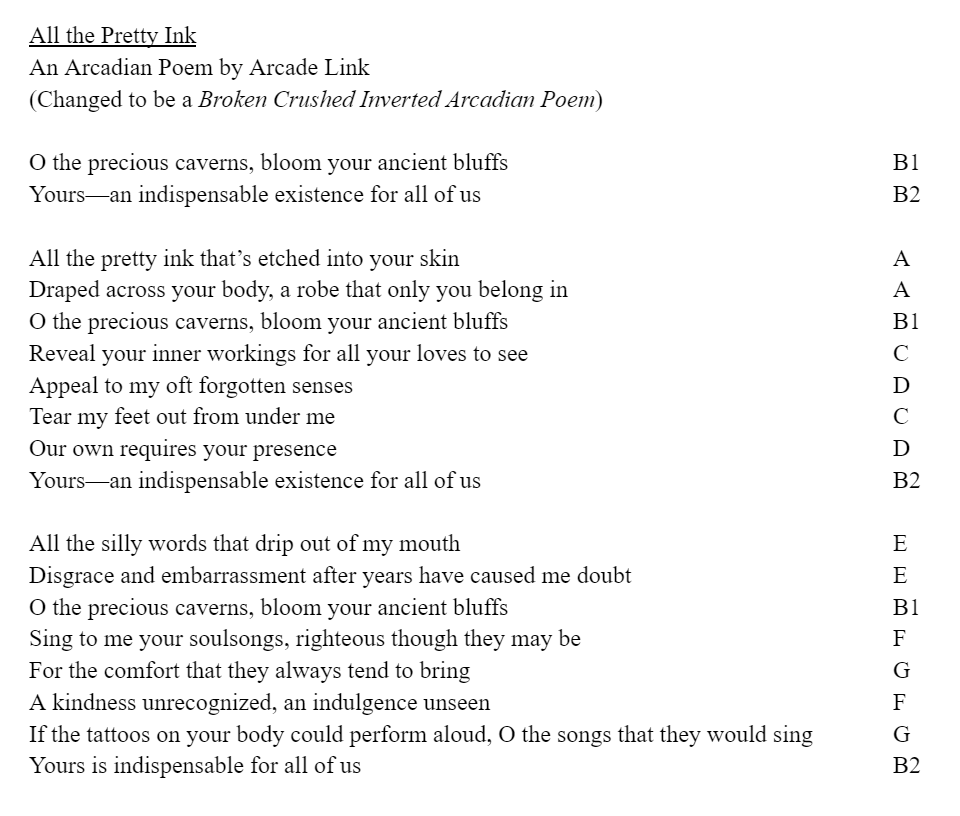 All of these forms can be combined. For instance a Crushed Extended Arcadian, would be 7 or more stanzas, where each stanza drops the last 3 lines. A Crushed Extended Inverted Arcadian would be the same but would also move the final stanza to the beginning of the poem. Each addition incorporates the rules of the form. The list of these forms is always alphabetical, and ends with “Arcadian.” Eg. Broken Collapsed Crushed Doubled Extended Inverted Arcadian.